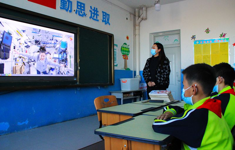2021年12月9日,呼和浩特市,玉泉区恒昌店巷小学师生在收看神舟十三号乘组航天员“天宫课堂”第一课。