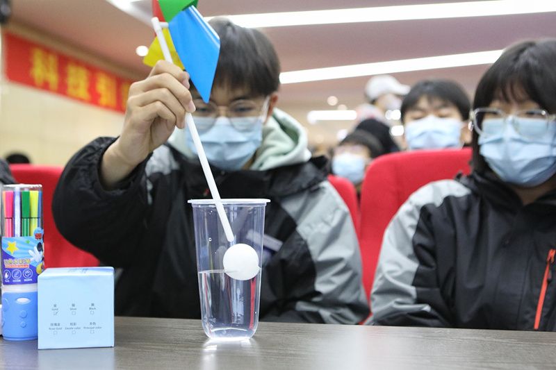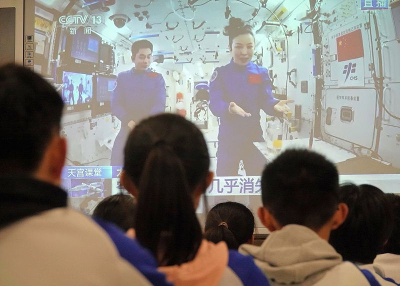 2021年12月9日,山东烟台,在航天员王亚平的母校福山一中,学生们观看中国空间站“天宫课堂”首次太空授课。