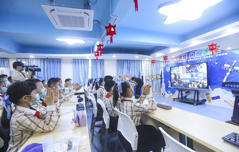 2021年12月9日下午,浙江省湖州市长兴县实验小学师生观看神舟十三号乘组航天员“天宫课堂”第一课。