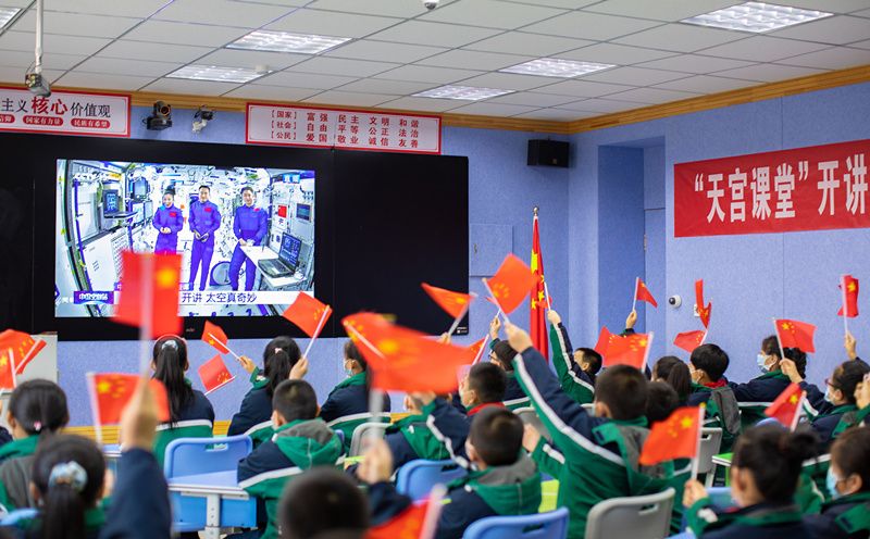 2021年12月9日下午,沈阳,“天宫课堂”与广大中小学生见面。神舟十三号乘组航天员翟志刚、王亚平、叶光富在中国空间站进行太空授课。