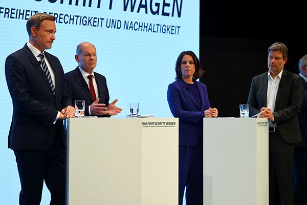 当地时间2021年11月24日,朔尔茨(左二)出席新闻发布会,宣布三党达成组阁协议。左一为自民党主席林德纳,左三、左四为绿党双主席贝尔伯克和哈贝克。 澎湃影像 资料图