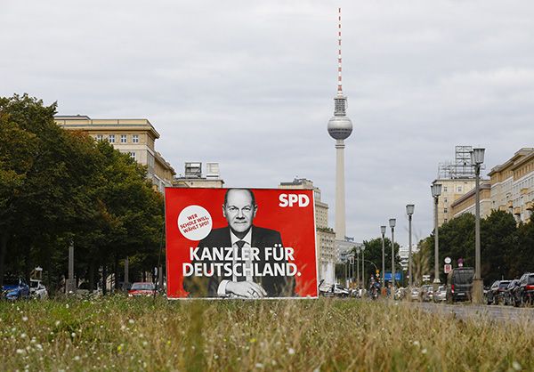 德国首都柏林街头的朔尔茨竞选广告,上面文字意为“为了德国的总理”,以及“谁想要朔尔茨(当总理),就选社民党”。 人民视觉 图