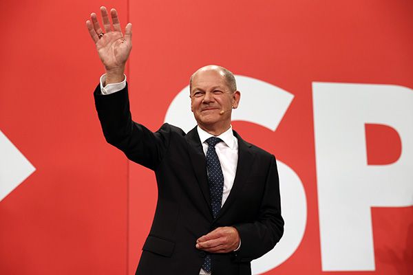 当地时间2021年9月26日,即大选投票日当晚,朔尔茨在社民党总部出席庆祝活动。 人民视觉 资料图