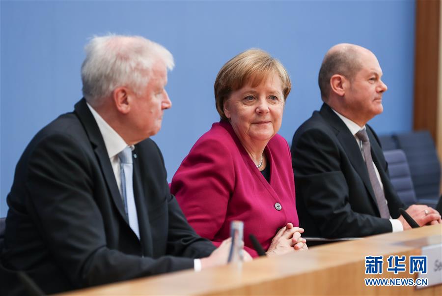 当地时间2018年3月12日,德国联盟党(由基民盟和基社盟组成)和社民党12日在柏林正式签署联合组阁协议。德国总理、基民盟主席默克尔(中),社民党代主席朔尔茨(右)和基社盟主席泽霍费尔出席新闻发布会。 新华网 资料图