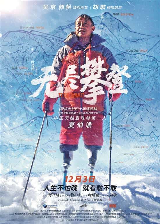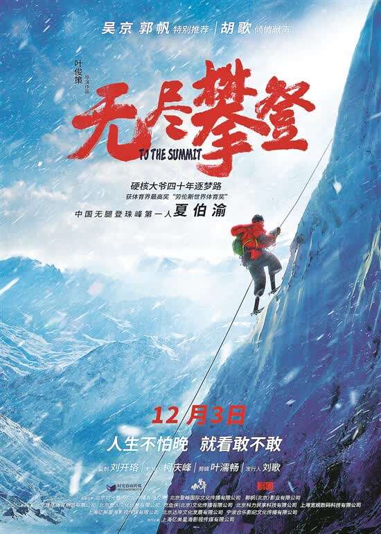 猫眼开分9.5分,淘票票开分9.5分,豆瓣开分8.1分……近日上映的纪录电影《无尽攀登》,昨日在各平台正式开分,口碑领跑同档期影片。该片由吴京、郭帆担任出品人,记录了中国登山家夏伯渝靠一双假肢五次冲顶珠峰,最终在69岁成功登顶的故事。正在进行的各地路演中,影片激起了无数观众的热血和热泪。