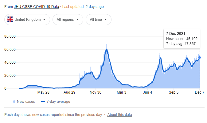 从11月初开始,英国疫情出现反弹。霍普金斯大学统计数据显示,目前全英国每日平均新增确诊病例数逐渐逼近5万例。