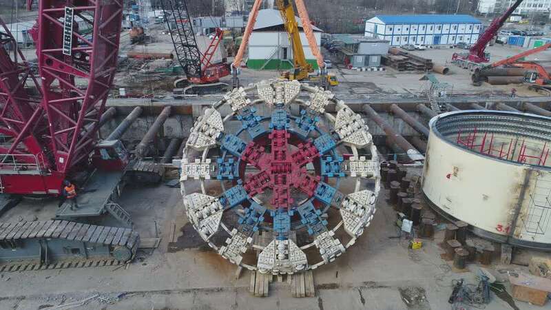 ↑在俄罗斯首都莫斯科,“胜利号”盾构机的刀盘在吊装中(2020年3月23日摄)。新华社发
