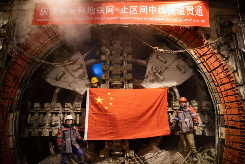 ↑在俄罗斯首都莫斯科,工作人员在地铁项目隧道全部贯通后在盾构机前合影(2019年12月26日摄)。新华社记者 白雪骐 摄