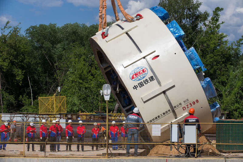 ↑在俄罗斯首都莫斯科,工人用起重机吊装盾构机核心部件,为掘进地铁隧道做好准备(2018年6月3日摄)。新华社记者 白雪骐 摄