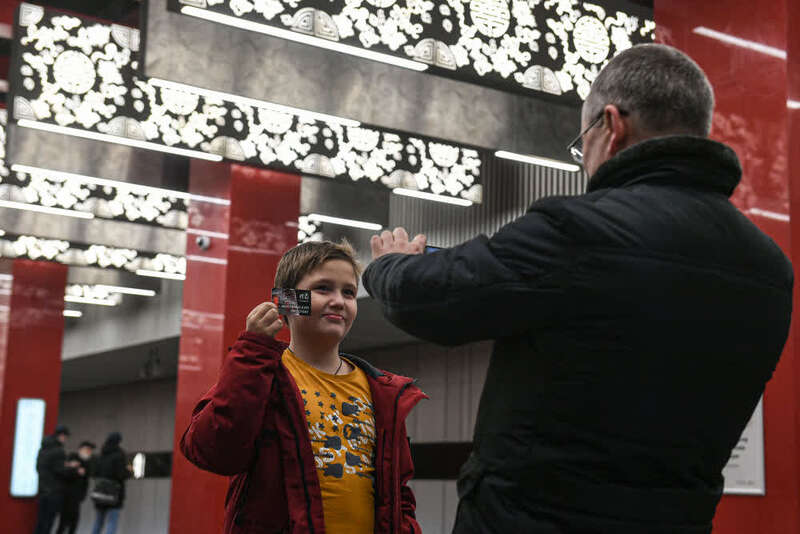 ↑12月7日,在俄罗斯首都莫斯科,一名小朋友手持印有米丘林大街站照片的地铁票留影。新华社发(叶甫盖尼·西尼岑摄)