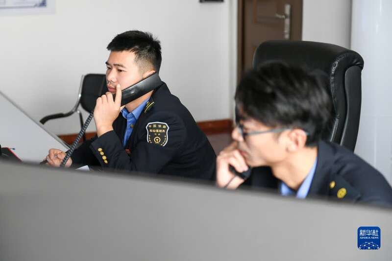 12月9日,呼和浩特南站值班员李志(左)对站场内列车进行调度管理。