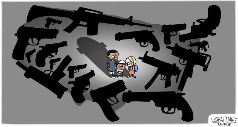 ▲ 枪支暴力将美国一幕幕魔幻的法治荒诞剧推向高潮。(漫画 | 刘蕊)