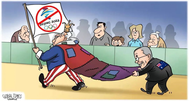 ▲ 美国拒绝联署北京冬奥会奥林匹克休战决议,宣称“外交抵制”北京冬奥会,才是祸害世界和平的毒瘤。而澳大利亚等国甘当侍从,卑微托起美国破烂不堪的披风。(漫画 | 刘蕊)