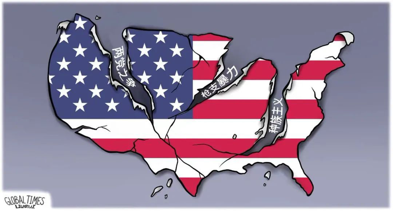 ▲ 美国政府的合法性被两党之争、枪支暴力、种族主义等问题分割得四分五裂,陷入严重的治理危机。(漫画 | 刘蕊)