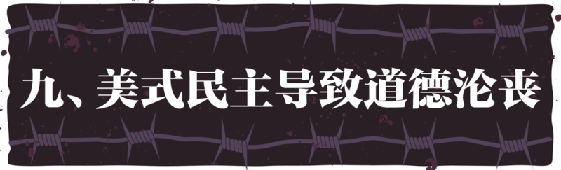 美国《外交政策》杂志严肃发问:“美国已进入魏玛时代?”1919年到1933年,德国的魏玛时代是自由放任、极端民主、激进人权的代名词,也是性解放、反传统家庭的代名词。魏玛时代民主迷幻、醉生梦死的同时,贫富分化、社会极化,极右民粹的纳粹主义强势崛起,通过世界上最民主的投票程序选举上台,开始了人类历史上最黑暗的一页。
