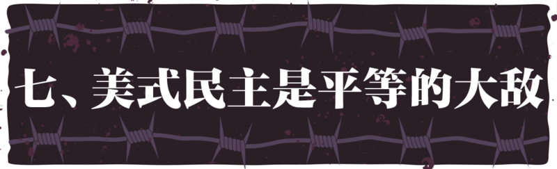 民主意味着全体社会成员有平等的政治权利。但美国却悄悄将平等概念表象化、泡沫化,选民只有在投票时是一人一票,但投票后又变成赢者通吃,导致政客在选举时轻易承诺、漫天许愿,选举后将承诺抛诸脑后、毫无担当,选举时的平等反而成为了日后不公平的根源。