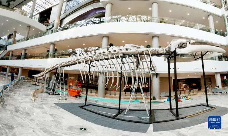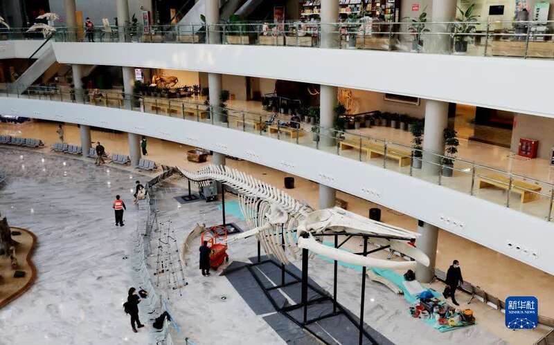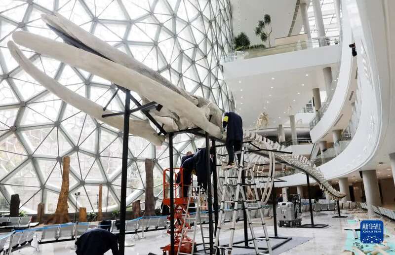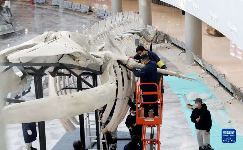 12月9日,上海科技馆标本制作团队技术人员在上海自然博物馆内搭建长须鲸骨骼标本。新华社记者 方喆 摄