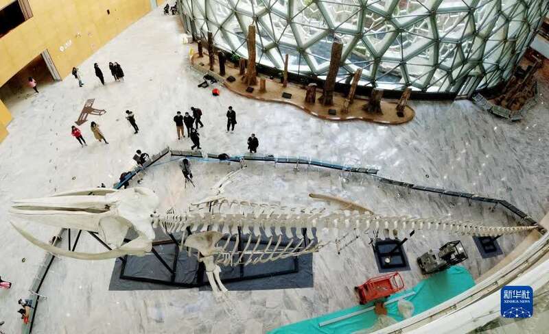 这是在上海自然博物馆内搭建完成的长须鲸骨骼标本(12月9日摄)。新华社记者 方喆 摄