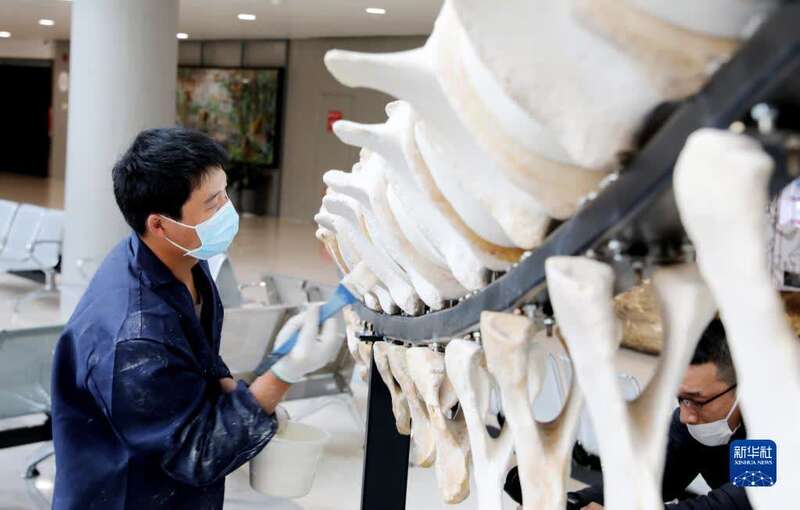 12月9日,上海科技馆标本制作团队技术人员在上海自然博物馆内搭建长须鲸骨骼标本时使用油画色对骨架部分泛黄处进行遮盖处理。新华社记者 方喆 摄