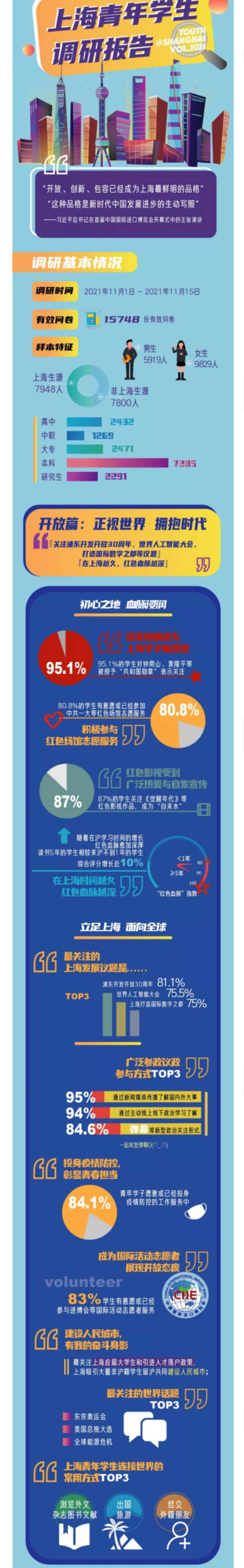 中国青年报客户端讯(中青报·中青网记者 魏其濛)日前,上海市学联发布了面向全上海高中及以上层次学校15748名青年学生的调研报告,报告对上海青年学生关注的上海发展议题、创新实践、就业意愿、兴趣爱好等情况进行了分析。