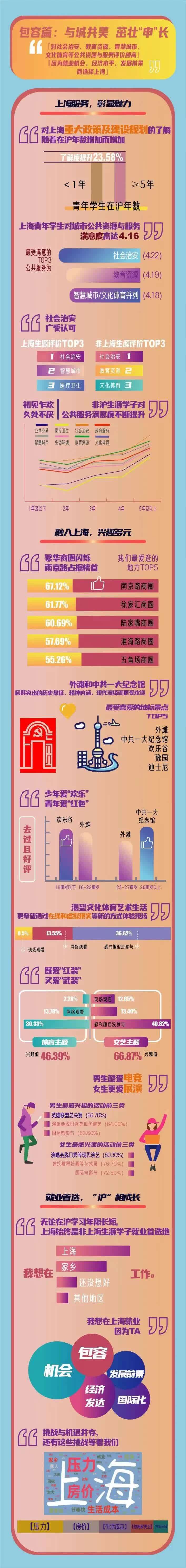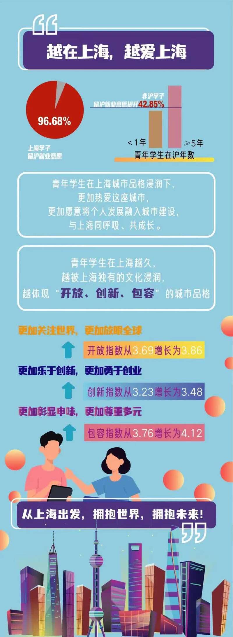 报告调研样本包括男生5919人、女生9829人,上海生源7948人,非上海生源7800人。报告显示,无论在沪学习年限长短,上海都是非上海生源学子的就业首选地;同时,在沪年数越长,留沪就业意愿也越高。吸引他们的原因包括上海“机会多”“包容”“经济发达”“发展前景好”“国际化”等;同时,他们也面临着“压力大”“房价高”“生活成本高”等挑战。同时,上海生源的留沪就业意愿高达96.68%。