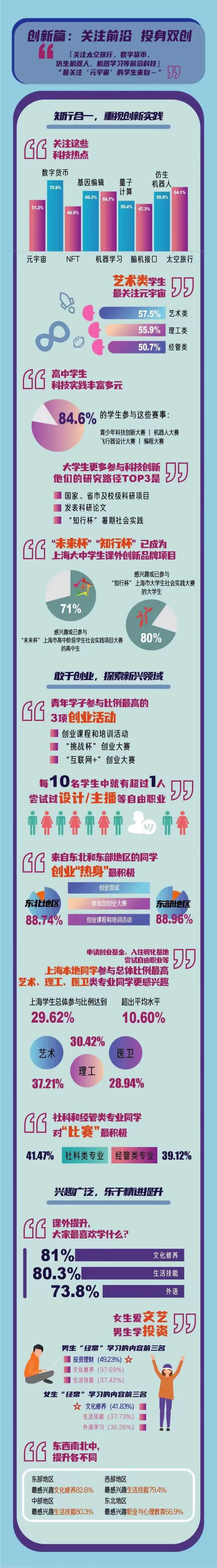 记者注意到,上海青年学子关注前沿科技,乐于投身“双创”。在接受调研的样本中,每10名学生中就有超过1人尝试过设计、主播等自由职业;申请创业基金、入住孵化基地、尝试过自由职业的占比19.02%,其中上海生源总体参与比例达29.62%。在接受调研的大学生中,参与科技创新的研究路径TOP3是国家、省市及校级科研项目,发表科研论文和“知行杯”暑期社会实践。青年学子参与比例最高的三项创业活动是创业课程和培训活动、“挑战杯”创业大赛和“互联网+”创业大赛。