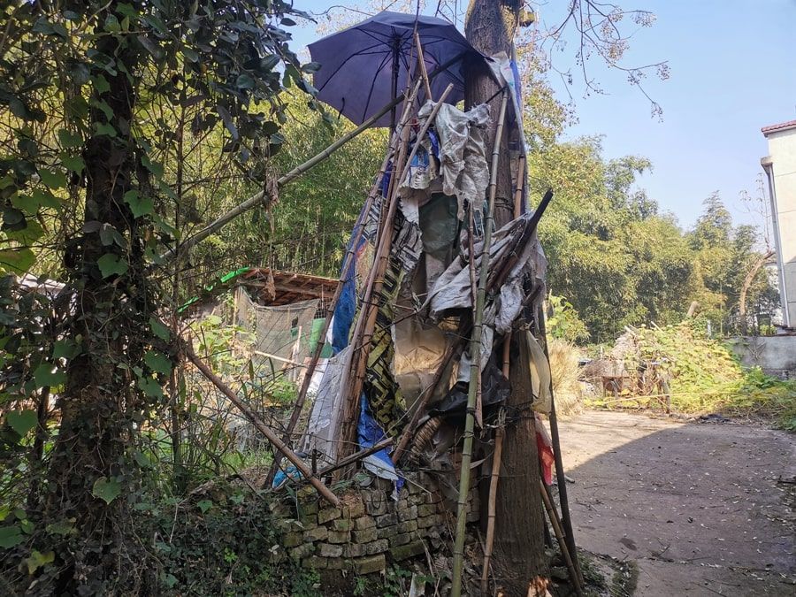 在老人家院里,搭建有一个临时厕所。厕所十分简陋,依托一棵树干,一堆竹竿杂乱无章地撑起架子,架子上面绑覆着破烂脏污的塑料布、广告布、肥料袋,在厕所顶部竖立着一把黑伞,用以遮风挡雨。