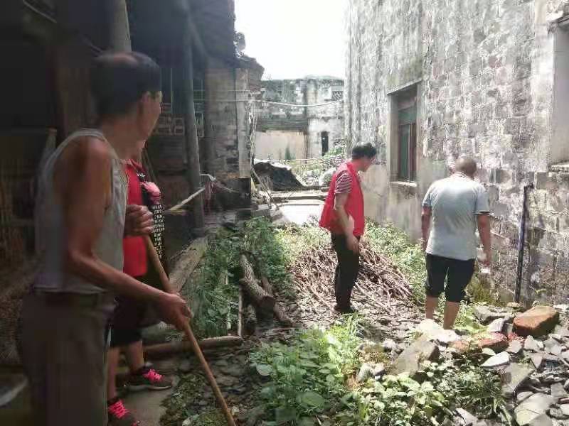 志愿者在黄柏兴老人屋外勘察管道,准备施工