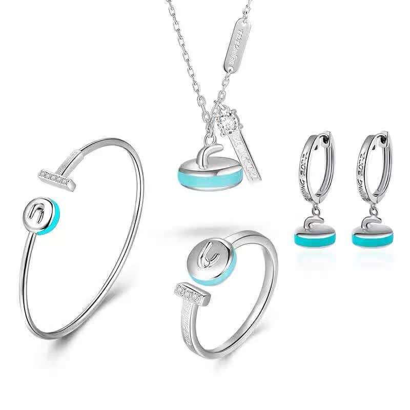 ↑北京2022年冬奥会冰上精灵系列耳环、项链、手链、戒指(选取冬奥项目中的冰壶造成作为设计,采用了珐琅以及镶嵌工艺)