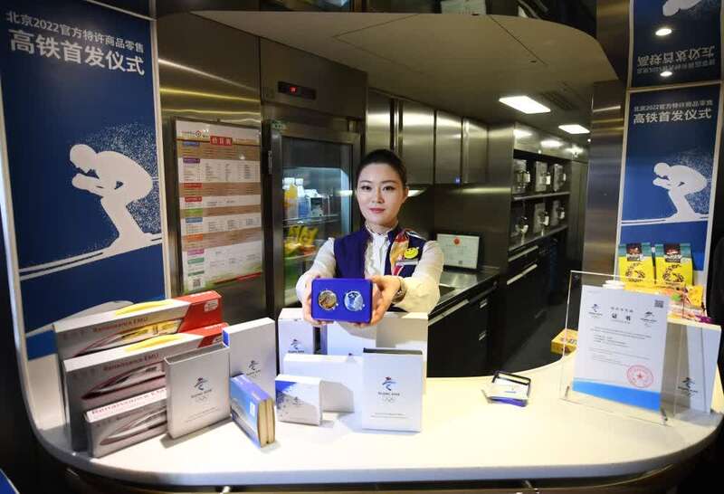 ↑2018年12月27日,北京冬奥组委在中国铁路北京局高铁动车组列车G119次(北京南站至上海虹桥站)上举行北京冬奥会官方特许商品高铁首发式,北京冬奥会特许商品正式登上高铁列车。新华社记者张晨霖摄