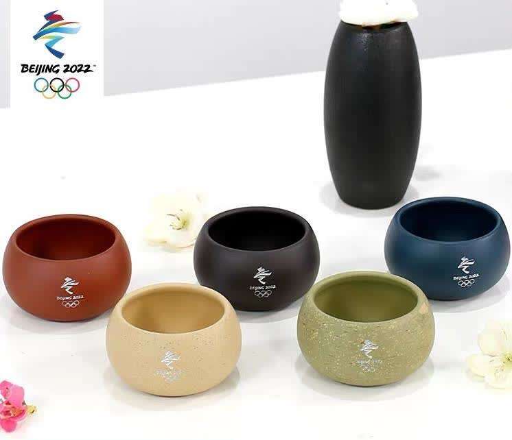 ↑北京2022系列五色紫砂功夫茶杯(采用原矿泥料精工制作,其创意灵感来源于奥运五环的色彩,杯型圆润光滑,小巧精致,拿捏适手)