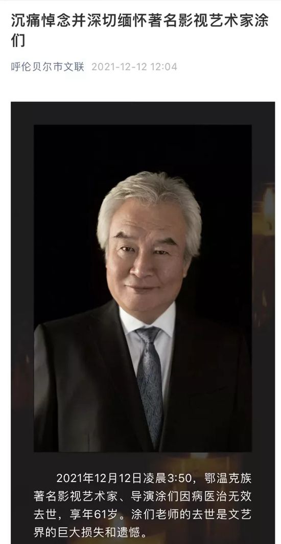 12日,呼伦贝尔市文联也发布题为“沉痛悼念并深切缅怀著名影视艺术家涂们”的文章,文中写道:“在几十年的艺术生涯中,涂们为自治区及呼伦贝尔的文化艺术事业做出了诸多贡献。