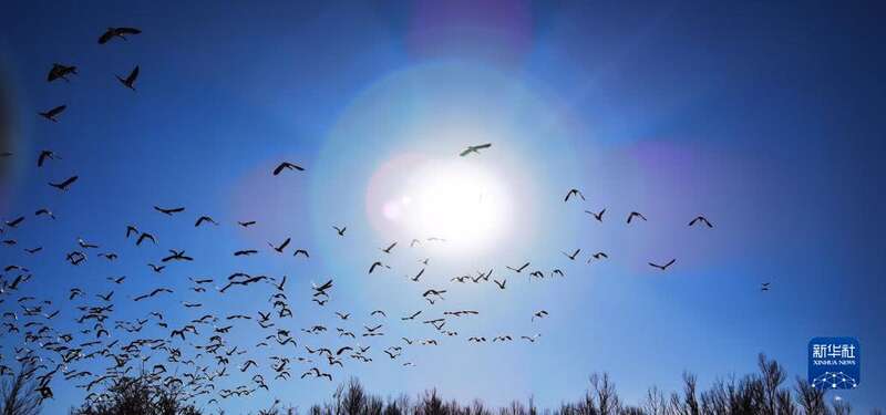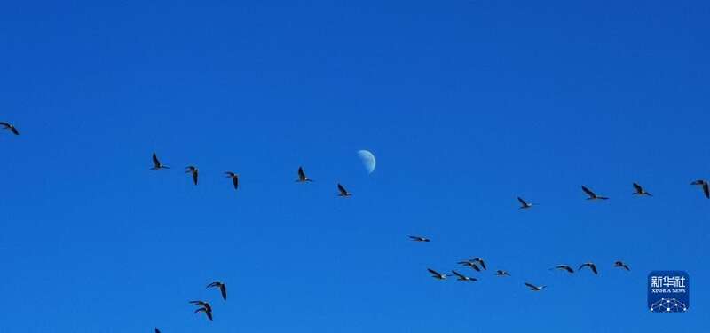 候鸟飞过唐嘎湿地(12月11日摄,手机照片)。新华社记者 沈虹冰 摄