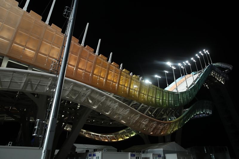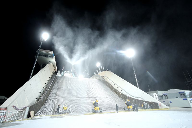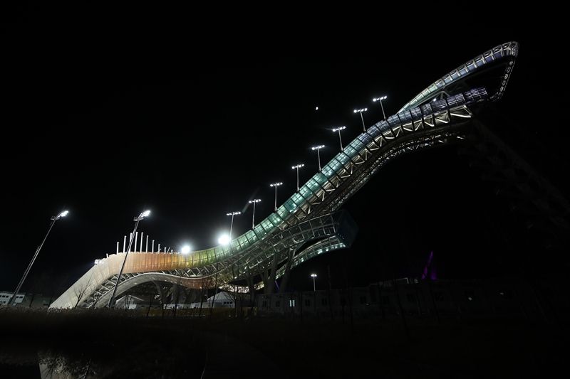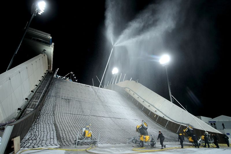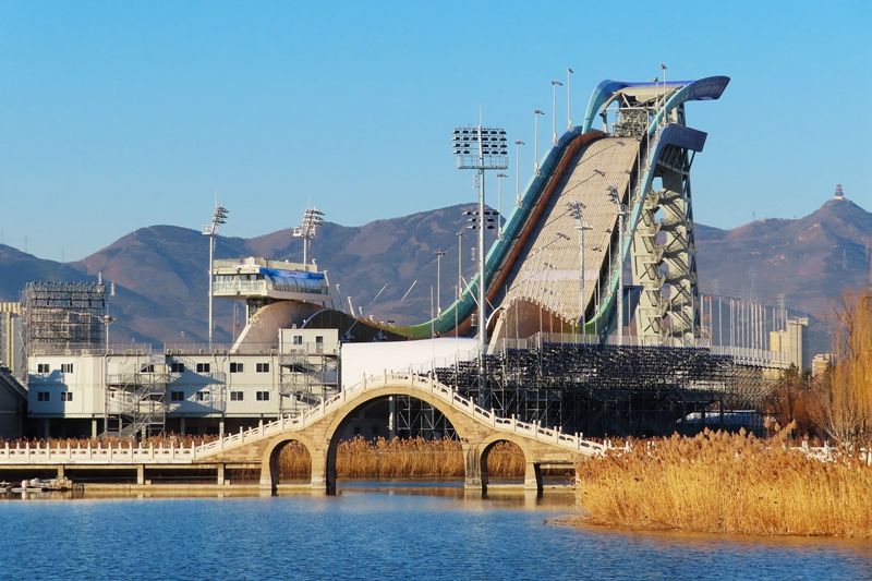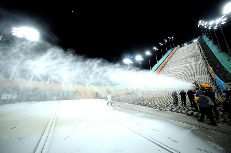2021年12月12日,北京,石景山区的首钢滑雪大跳台正式启动造雪工作。