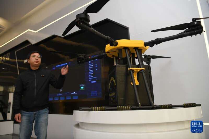 在国邮快递物流智能装备(南陵)产业技术研究院内,工作人员在介绍一款快递配送无人机(12月10日摄)。新华社记者 张端 摄