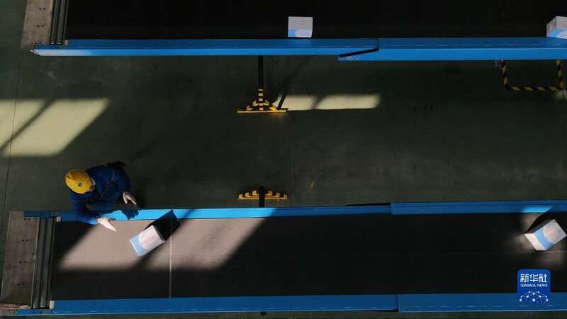 12月10日,在芜湖市双彩智能科技有限公司,工作人员对一款物流智能分拣设备进行测试(无人机照片)。新华社记者 张端 摄
