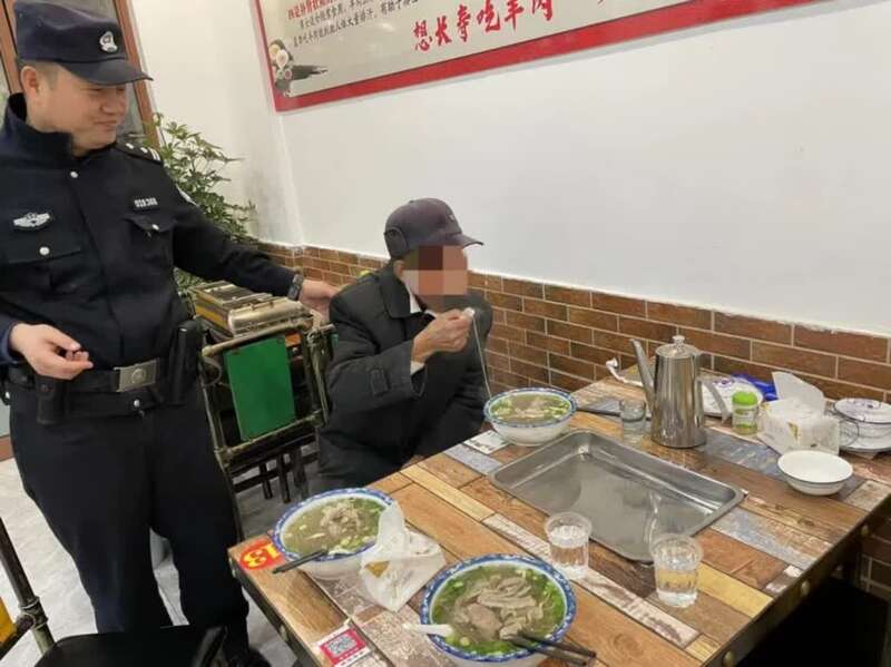 刘海洋看到不远处一家羊肉汤馆还亮着灯,就搀扶着老人来到店里。经过一番信息比对,刘海洋终于找到了老人家庭信息,并电话通知其大儿子来将老人接回家,刘海洋为老人点了一碗羊肉汤暖身。