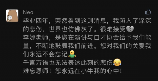 据澎湃新闻报道,李娜曾连续两年获“我最喜爱的老师”荣誉称号。从事思想政治理论课教学的10年期间,她年均工作量达到400学时以上。课余时间,她通过QQ与数千名学生交流谈心;后来,她还在学校官方新媒体微信平台开设“分享”专栏,每周一个专题。