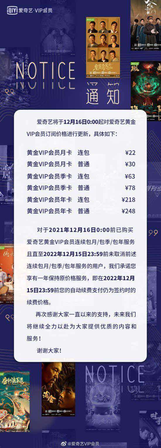 今日,爱奇艺官方宣布将从12月16日零时起对爱奇艺黄金VIP会员订阅价格进行调整,月卡和季卡涨幅在9%-20%之间,爱奇艺对此这波涨价解释为“视频平台的会员订阅价格一直偏低,这一现象已影响到了行业的健康发展。为了建立更加良性的产业生态,让优秀的内容生产者有所回报,最终为会员提供更多、更好的内容,我们决定对会员价格做出调整。”