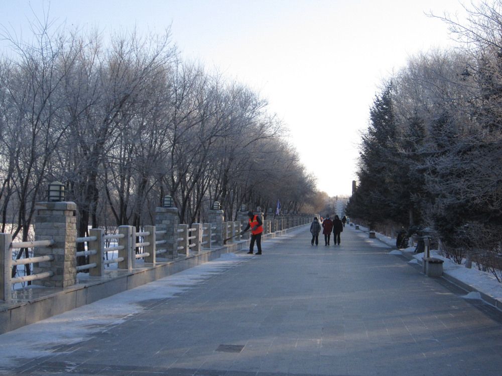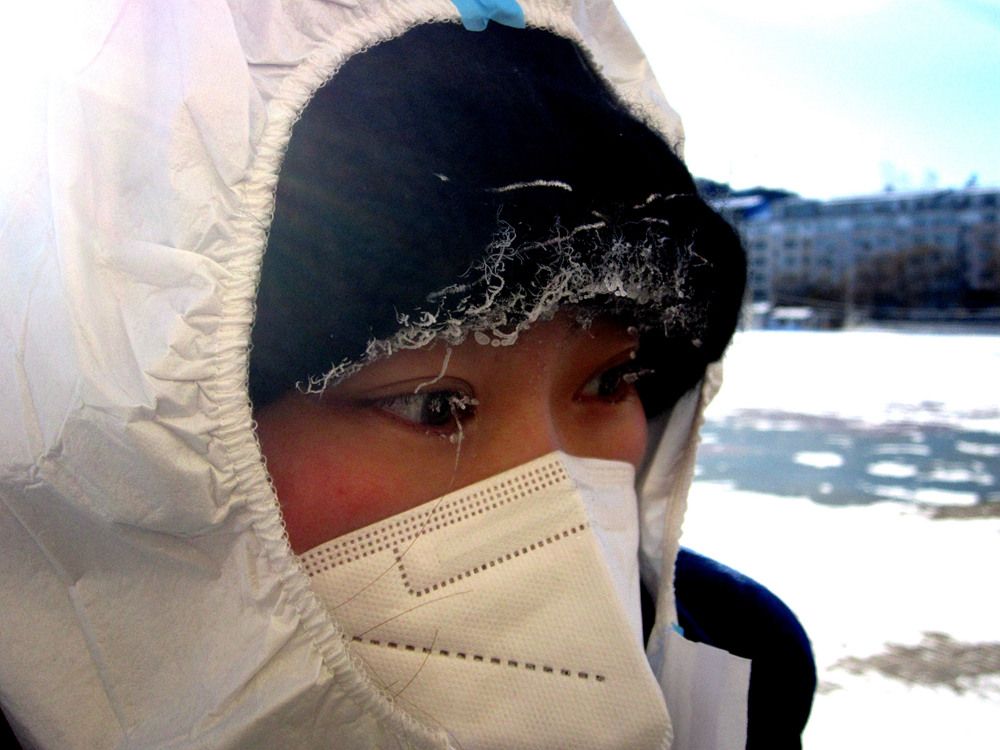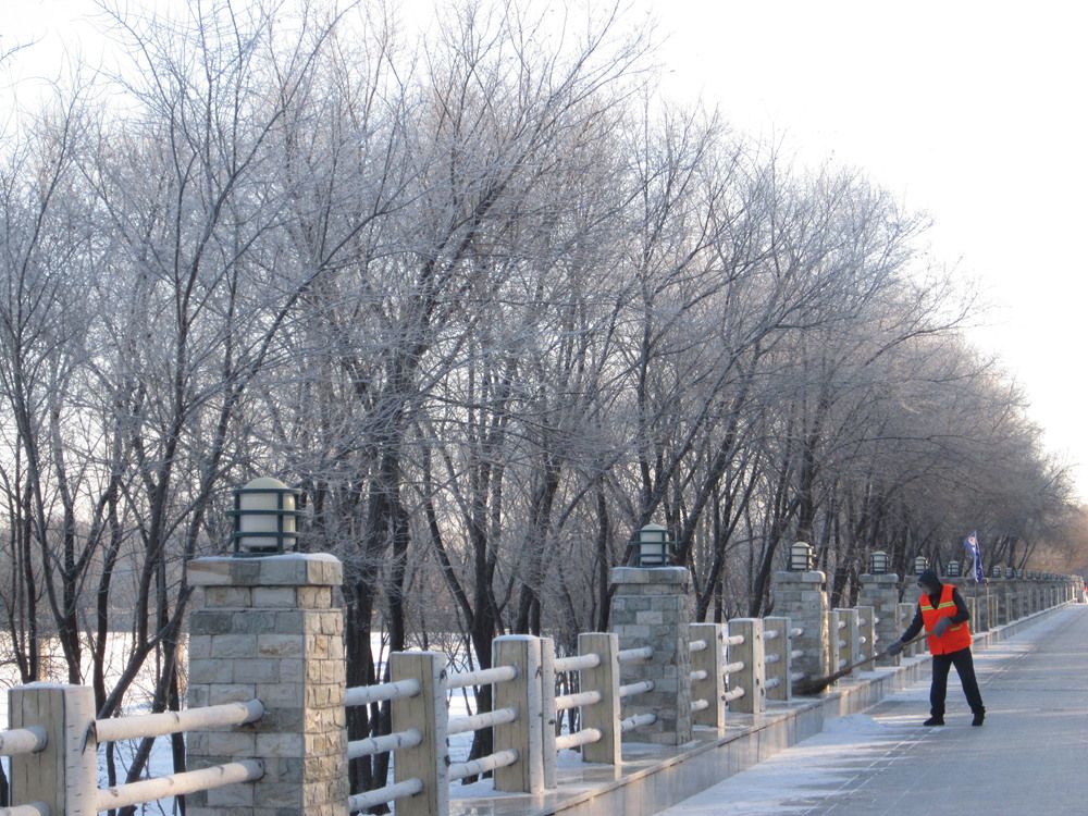 2021年12月15日,黑龙江省黑河市志愿者协会会员在寒冷的天气里。