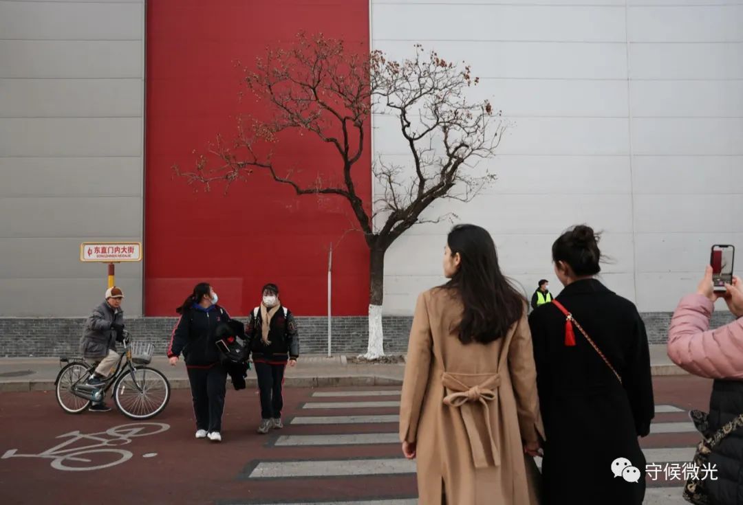 近两个月,东直门成为北京炙手可热的打卡地,这棵树功不可没。它不是什么奇特品种,只因为不偏不倚地坐落在红白参半的背景墙前。这处围挡墙已经矗立在此数年,它围住的是2016年开建的北京地铁机场线西延工程,该工程预计今年年底建成通车。