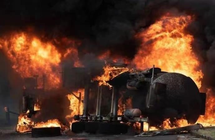 据悉,事发时油罐车为避开一辆摩托车而在转向时失控翻倒。随后附近居民不顾司机的警告,冲向油罐车争抢汽油。