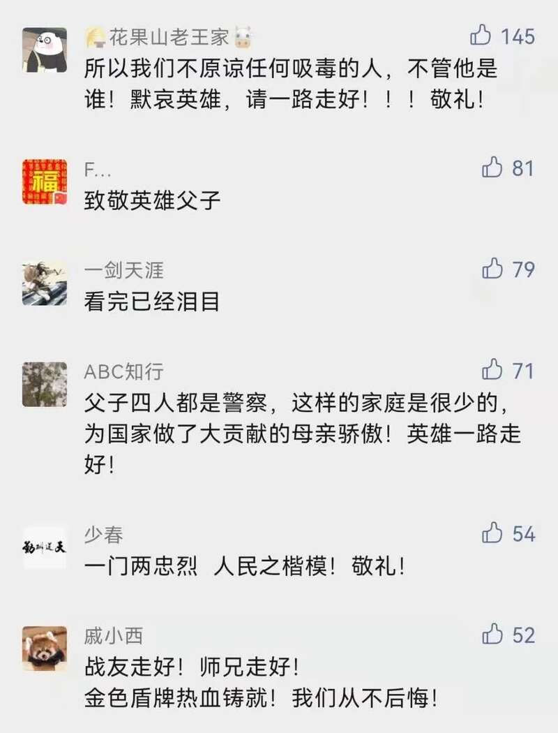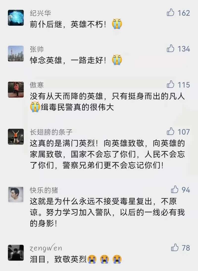 “之所以能生活在阳光下,是因为有人替我们挡住了黑暗!致敬中国缉毒警察!”“吸毒人员花的每一分钱都是打在缉毒警察身上的子弹”……无数网友写下了自己的心声。