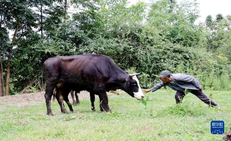 贵州威宁彝族回族苗族自治县观风海镇村民安国升在喂牛(8月6日摄)。新华社发(陈武帅 摄)