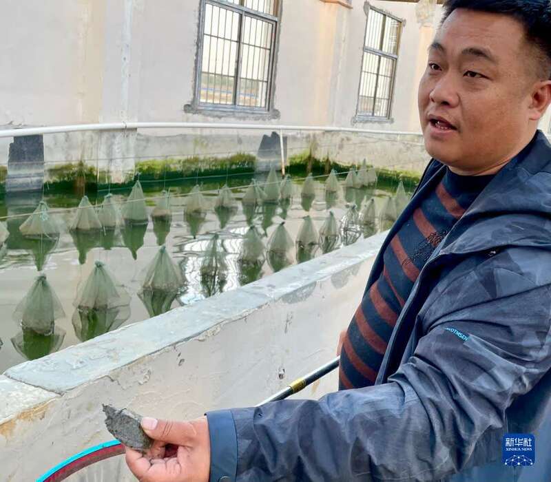 湖南省汉寿县明珠种养专业合作社负责人戴鹏飞向记者介绍甲鱼种苗生长情况(12月1日摄)。在农村金融帮助下,位于洞庭湖区的汉寿县水产养殖业蓬勃发展。新华社记者 苏晓洲 摄