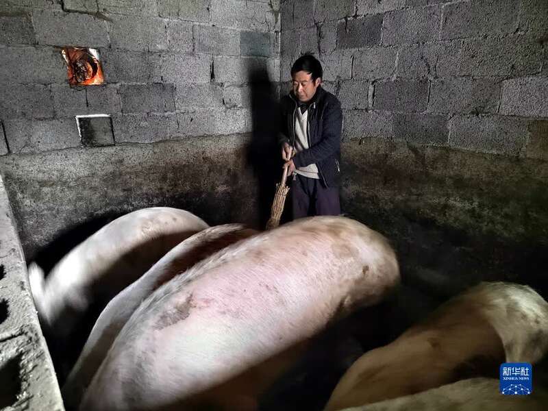 12月15日,重庆市奉节县平安乡养殖户汪圣兵在清理猪圈。新华社发(刘慧 摄)
