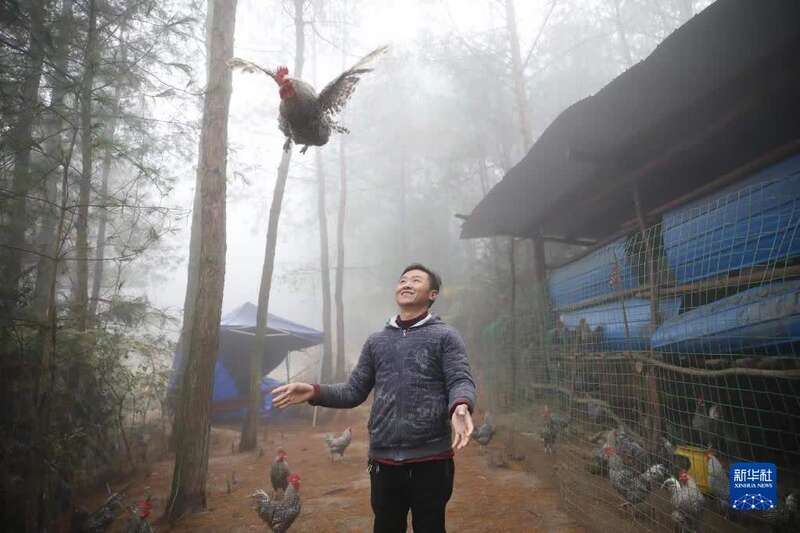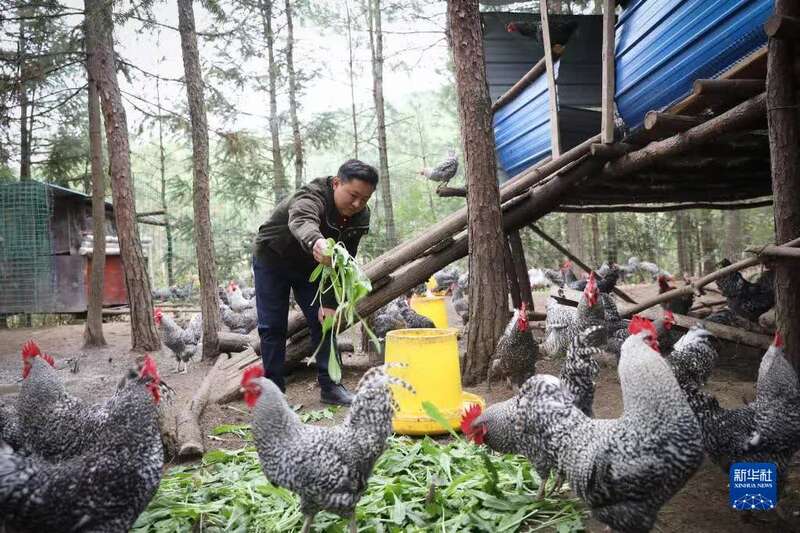 在重庆市丰都县三建乡夜力坪村,养殖户熊勇在照料自己的芦花鸡(2020年11月16日摄)。新华社发
