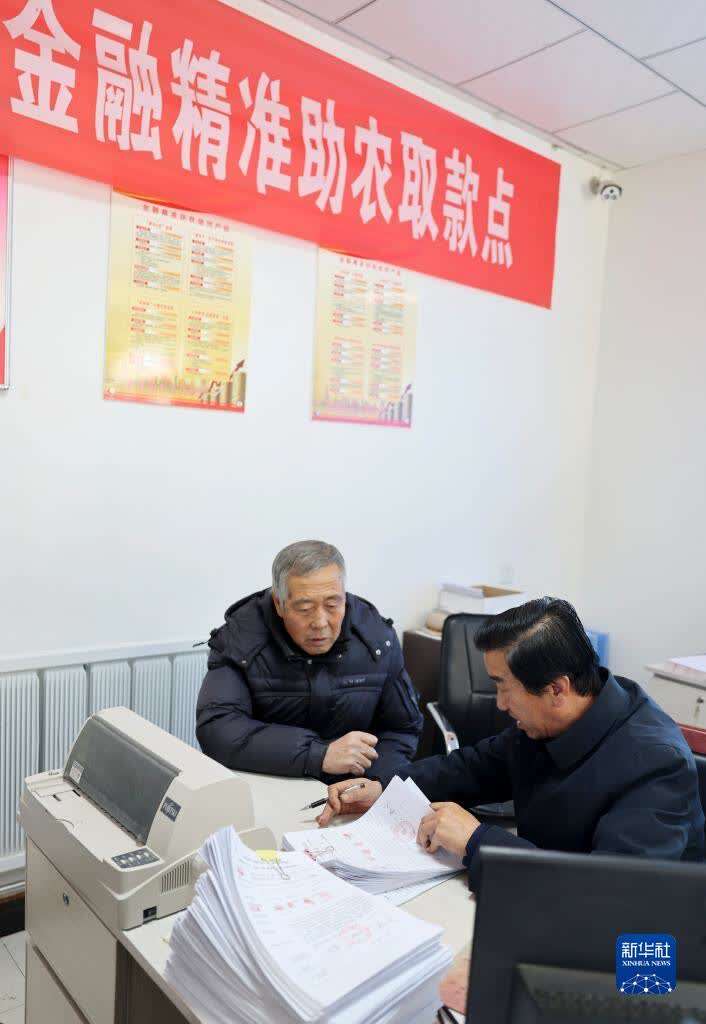 12月10日,在宁夏盐池县王乐井乡曾记畔村黄河农村商业银行综合网点,工作人员(右)在整理村民签订的小额信贷合同。新华社记者 王鹏 摄