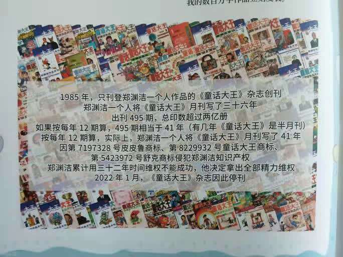 《童话大王》月刊已发行36年,总发行量逾2亿册。“最早的读者是70后,一直到10后,五代读者。”郑渊洁在接受澎湃新闻记者采访时说,“虽然难以割舍,但我必须要用这样的方式来表明自己的态度。我实在觉得维权力不从心,作品就是作家的孩子,当你知道自己的孩子去一个地方,一定会有危险的时候,没有家长会让孩子去。什么时候672个侵犯我知识产权的商标全部维权成功,《童话大王》就会复刊。”郑渊洁说,“但这有个前提,我希望自己能活到100岁。”
