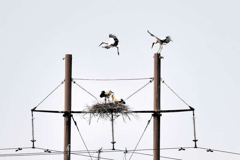 在黄河三角洲自然保护区,电线杆上直径数米的东方白鹳的巢。新华社记者郭绪雷 摄
